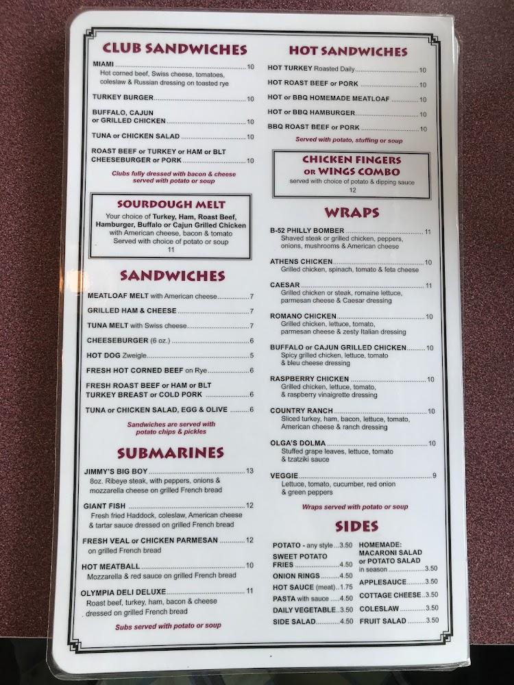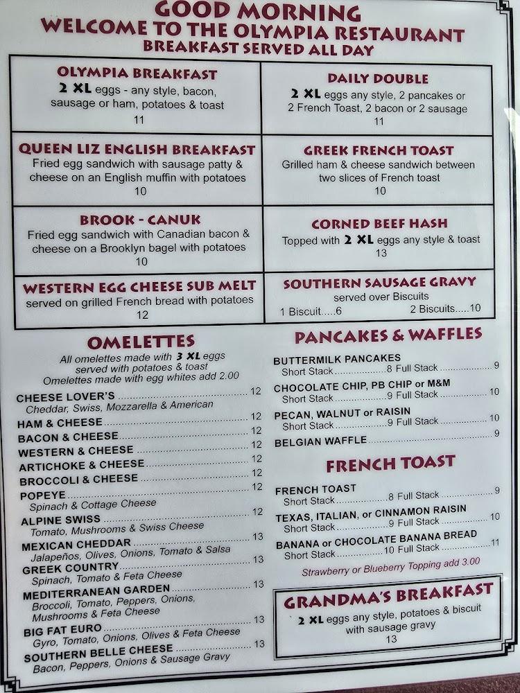 Olympia Family Restaurant offers a diverse selection of classic diner fare. Breakfast items include delightful omelets, pancakes, and French toast served all day. Their eggs Benedict is a favorite among guests, unique and flavorful. Lunch features comforting sandwiches, burgers, and fresh salads. Diners can choose from options like the Texas Burger and wraps, all made fresh to order. The kids' menu thoughtfully caters to younger diners, ensuring everyone finds a favorite. Avail of daily specials that highlight seasonal ingredients for delightful surprises. Desserts, like house-made pies, round off meals with sweetness. Overall, the menu caters to both families and individuals looking for hearty meals.